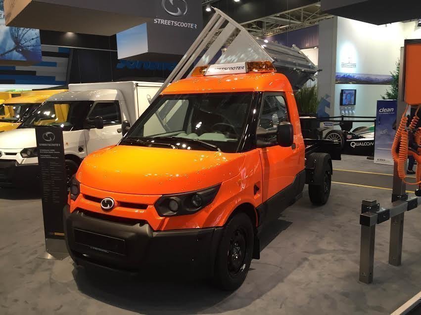 Немецкая почта решила стать автопроизводителем и купила для этого маленькую фирмочку Sreetscooter. Сегодня производство достигло приличного уровня, пять электропочтальонов в день, хотя потом обещают делать по десять тысяч в год. Специализированные желтые фургончики способны пробежать до зарядки 80 км. и увезти 850 кг. писем и посылок. Пока сторонним клиентам ничего продавать не собираются, но на стенде стоял оранжевый самосвал.
