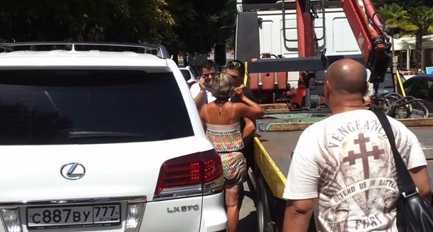 Судя по номерным знакам автомобилист прибыл из Москвы. Он оставил свой Lexus LX57 на парковке со знаком «для инвалидов». В результате приехал эвакуатор, что вызвало возмущение гражданина РФ, а когда роскошный внедорожник при погрузке сорвался с крана, из-за чего были повреждены колеса, то россиянин дал полную волю чувствам и словам.