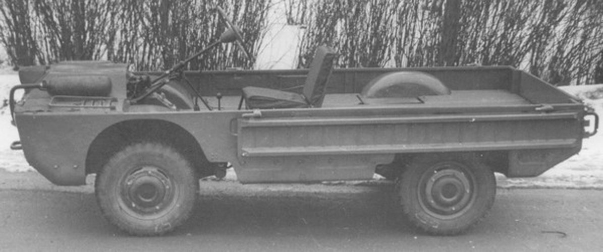 И вот зима 1957 года. Ирбит. Группа мужиков, в ушанках, телогрейках и сапогах, носит на руках машинку с мотоциклетным мотором, которую они должны сделать быстрой, плавающей и вездеходной. Водитель сидел посередине, по бокам у него было двое носилок, куда можно было положить раненых. В случае массированного обстрела водитель вообще мог ползти рядом, так как было предусмотрено управление дистанционное. Чтобы преодолевать траншеи и прочее, были приспособлены специальные трапики, которые сделали пустотелыми.