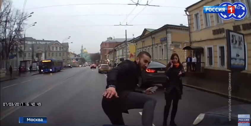 Мы не можем знать, кто перед нами — просто перепивший человек, который ведет себя неадекватно, или тренированный боец, — но в любом случае, даже если вы терминатор и можете сломать любого, нельзя вступать в физический контакт, не нужно лезть в драку. Вот этот инцидент, кстати, подтверждает, что лучшее средство — закрыться в машине и позвонить в полицию.