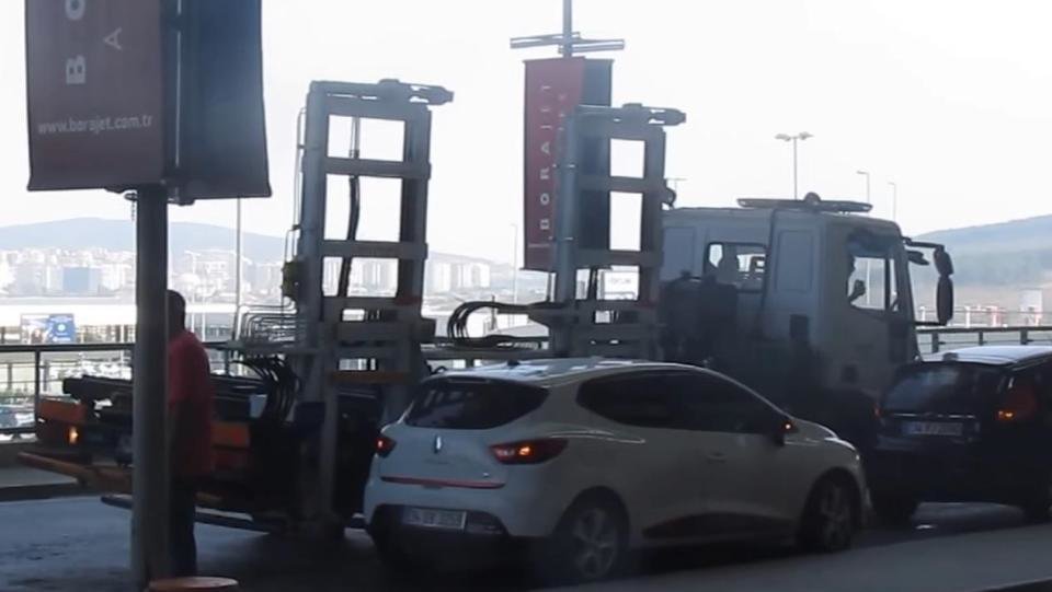 На стоянке близ Стамбульского аэропорта в Турции начал работать автопогрузчик, который эвакуирует неправильно припаркованные автомобили всего за одну минуту. Самое удивительное, что погрузка автомобиля осуществляется сбоку.