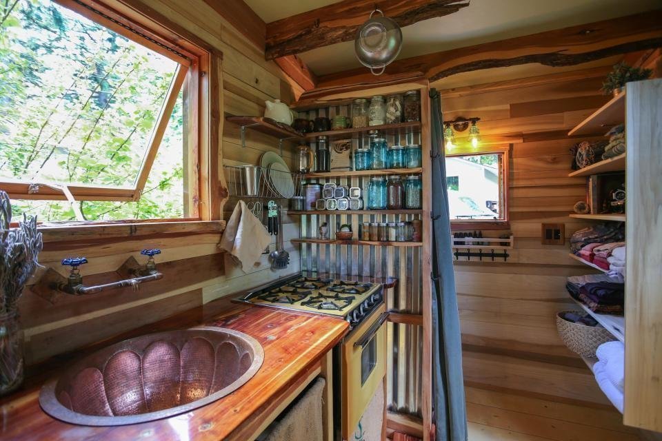 Крошечный караван-трейлер, с уютным деревянным интерьером, имеет следующие габариты: ширина — 2 метра, длина — около 5 метров, высота — от 2-х до 2,6 метров. Внутри домашняя кухня с медной раковиной, выполненной по индивидуальному заказу, уютная спальня-столовая и оцинкованная душевая кабина.