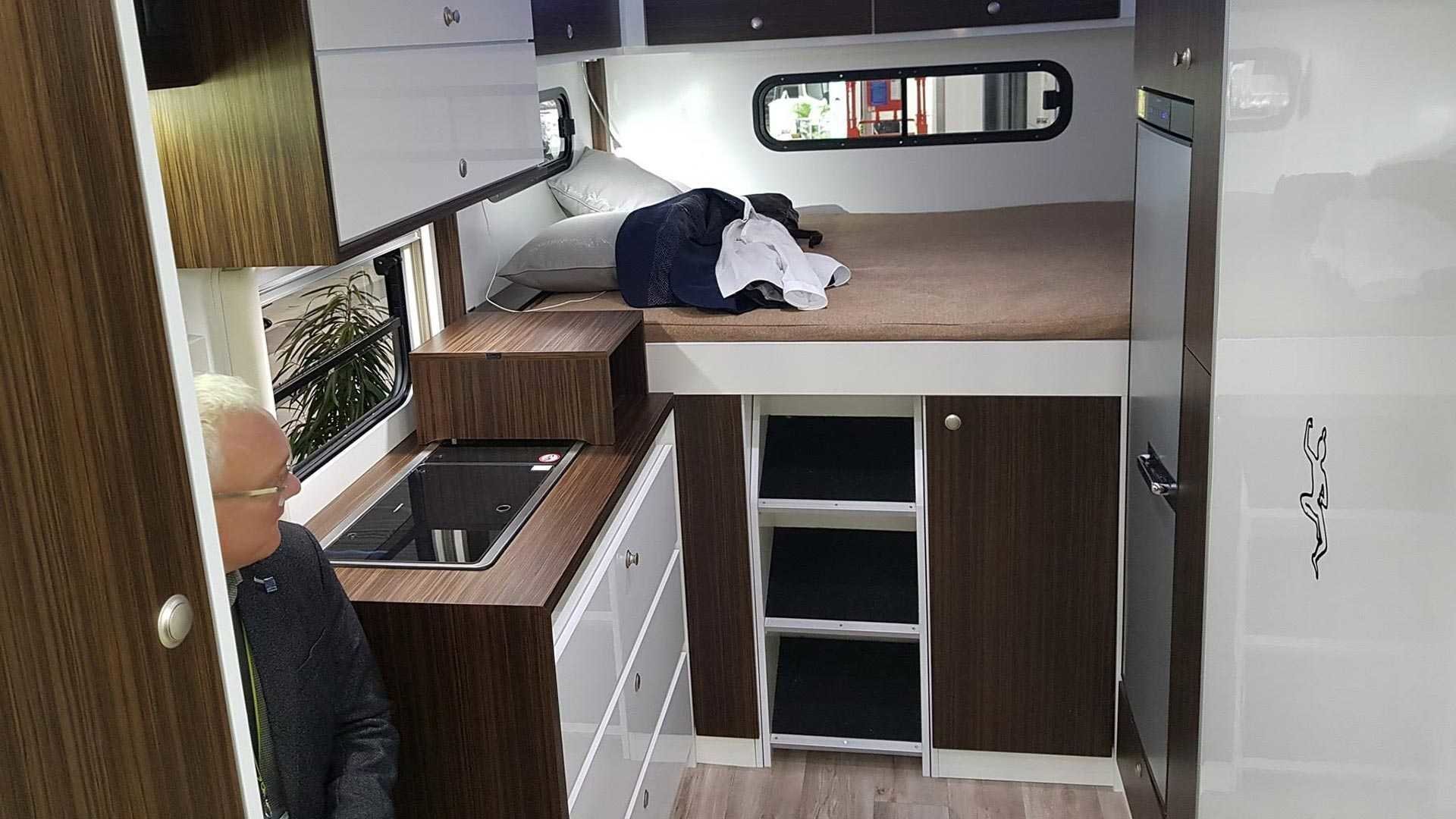 Предусмотрены кухня и санузел. Оснащение включает холодильник, плиту, раскладной стол и 90-литровый бак для воды.