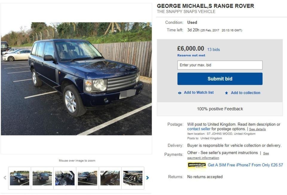 Спустя всего лишь несколько недель после смерти всемирно известной поп-звезды, один из лондонских автодилеров решил выставить на аукцион некогда бывший в распоряжении певца Range Rover. Роскошный внедорожник уже не молод — ему более 14 лет. Однако состояние машины близко к идеальному, уверяет продавец. Он также утверждает, что купил ее у Джорджа Майкла до его смерти и больше машина не меняла хозяина ни разу.