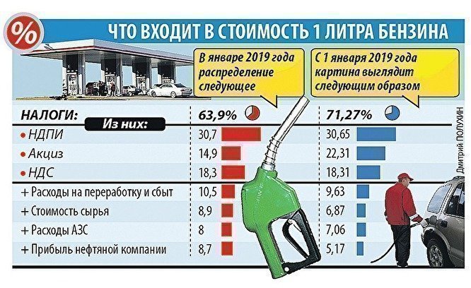 «Ценники на заправках отличаются более чем в 1,5 раза! В принципе, понятно, отчего так. Львиную долю чека c АЗС в России забирает себе бюджет. И второй момент: российская нефтяная отрасль сплошь суверенна и вертикально интегрирована. У казахов нет этой монополизации, а на рынке свободно работают иностранцы. В том числе — из России», — пояснил Нальгин и опубликовал инфографику о том, что входит в стоимость одного литра бензина в России.