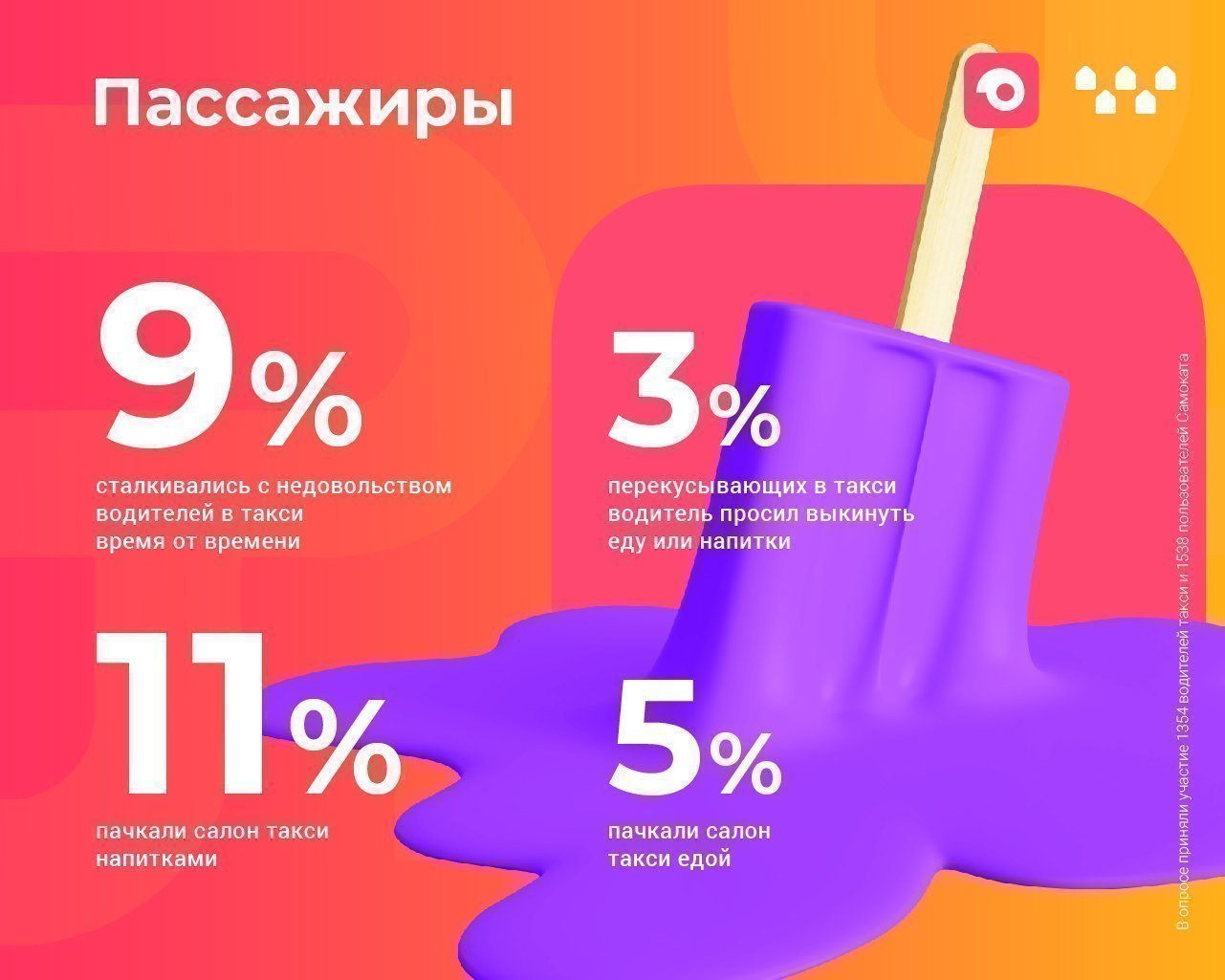 Сами пассажиры уверяют, что едят аккуратно: только 11% пачкали салон такси напитками и 5% – едой. Чаще всего таксисты нейтрально реагируют на жующих пассажиров: только 12% пассажиров сталкивались с ситуацией, когда водитель делал замечания или просил убрать еду.