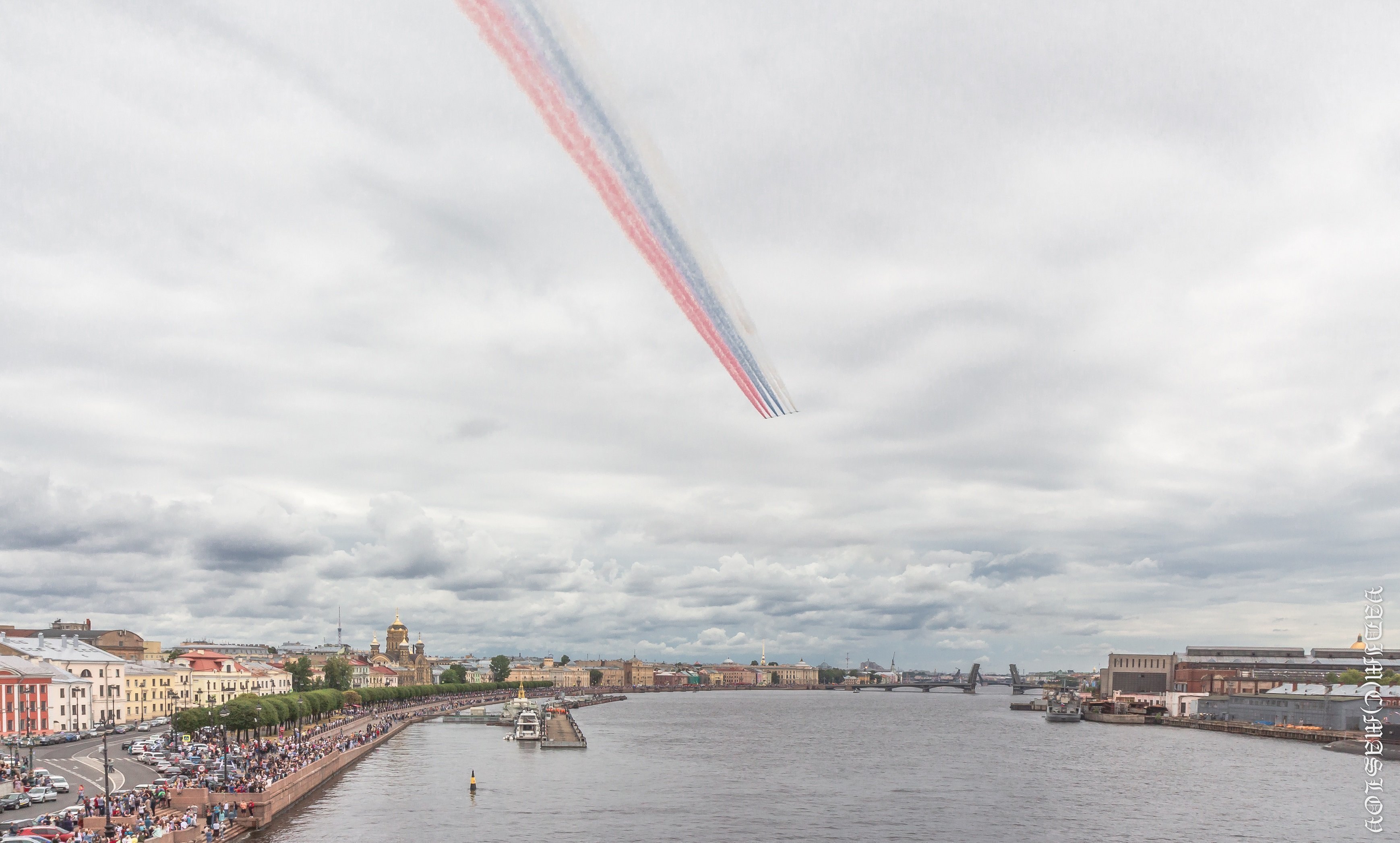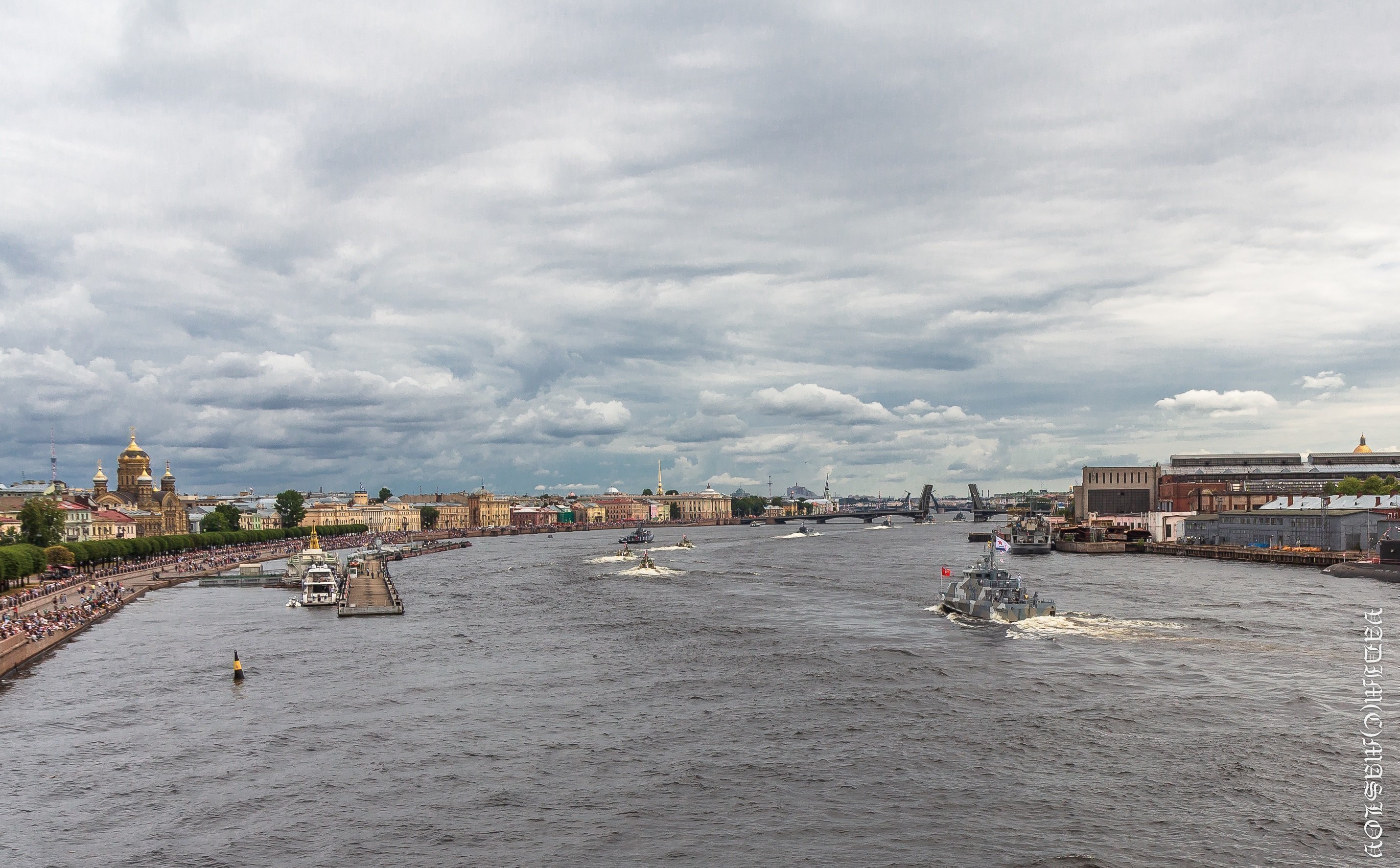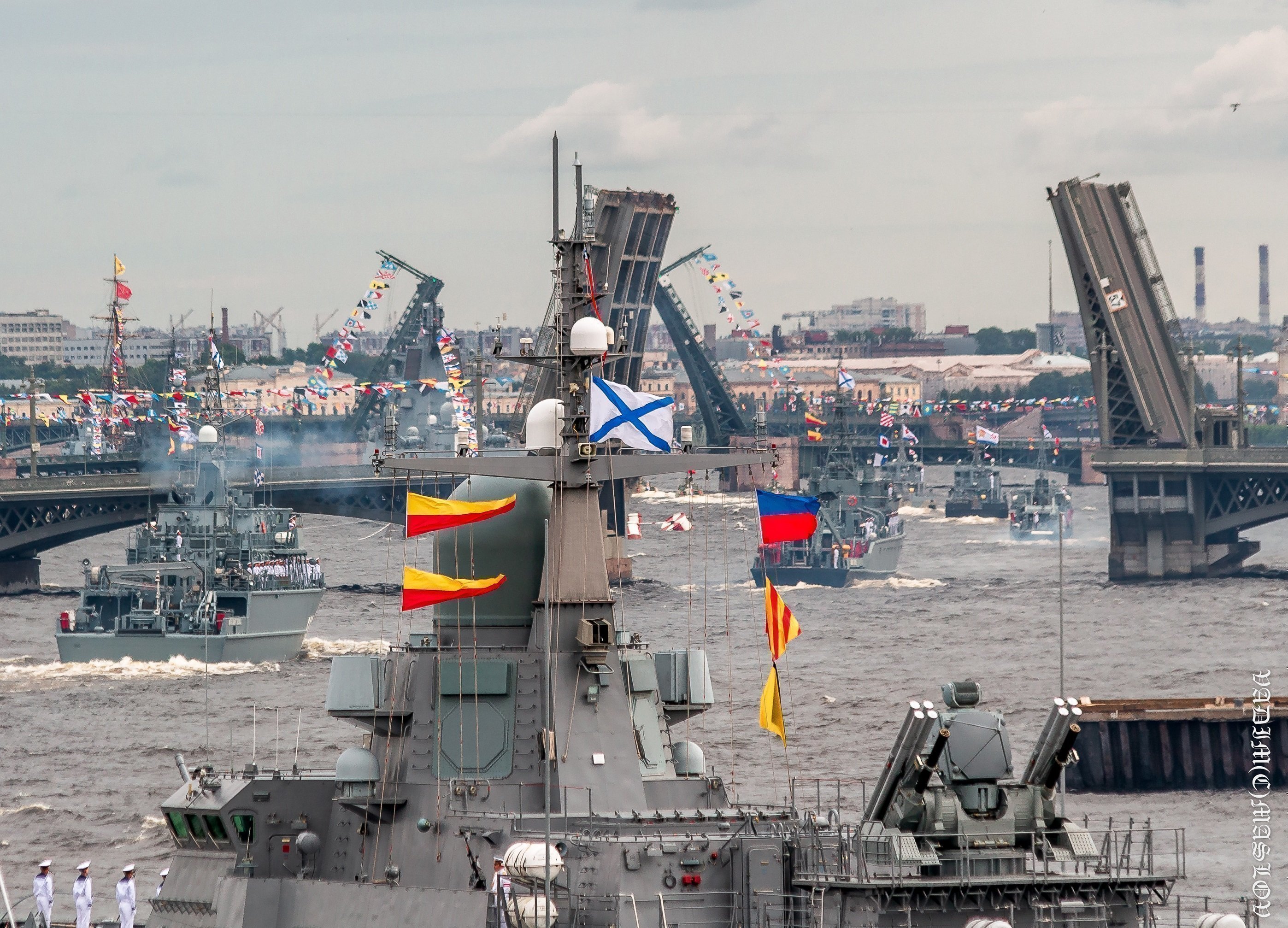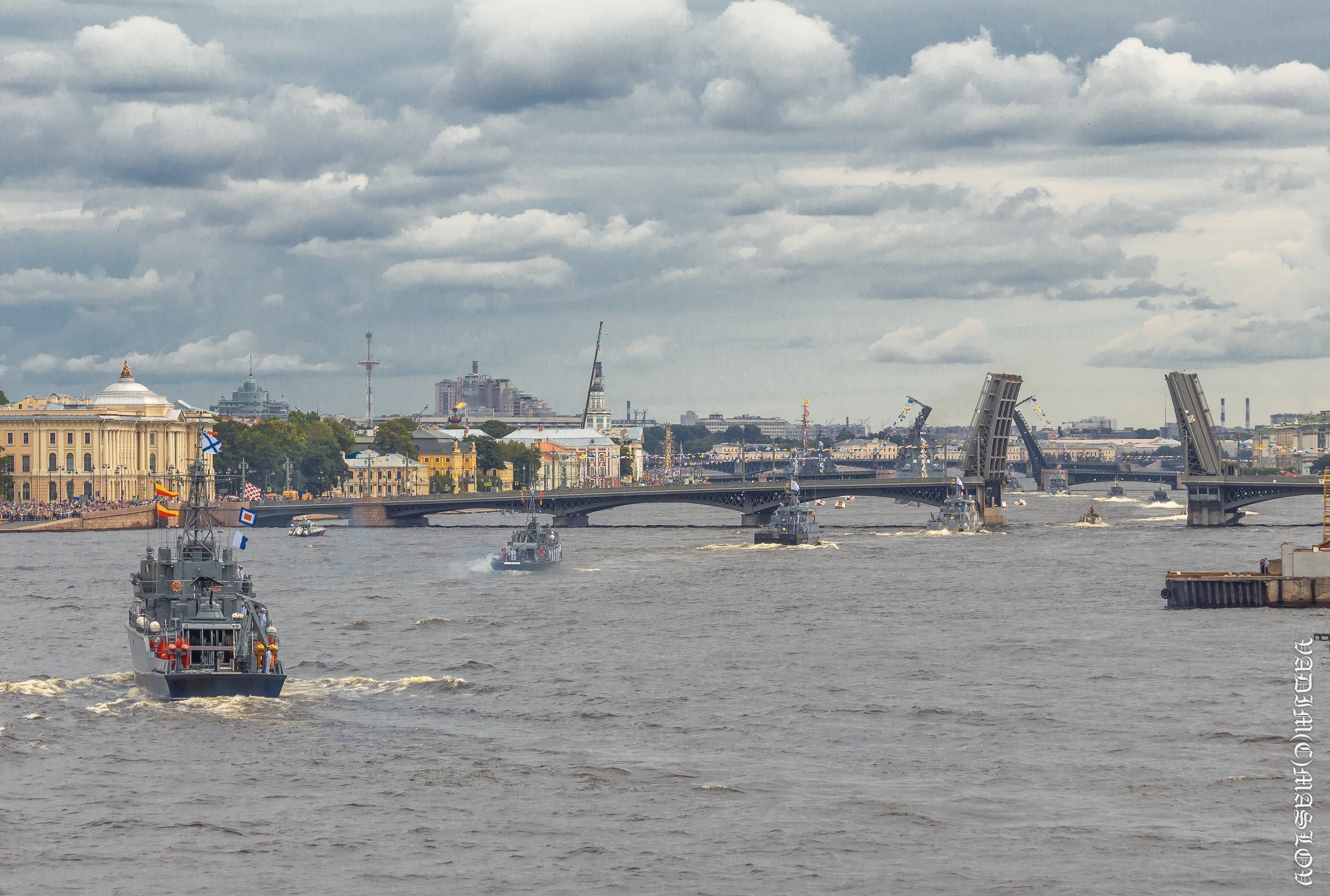 В Главном военно-морском параде в акватории Невы участвовали около 4 тысяч моряков, более 50 кораблей, катеров и подводных лодок, а также 48 самолетов и вертолетов морской авиации.