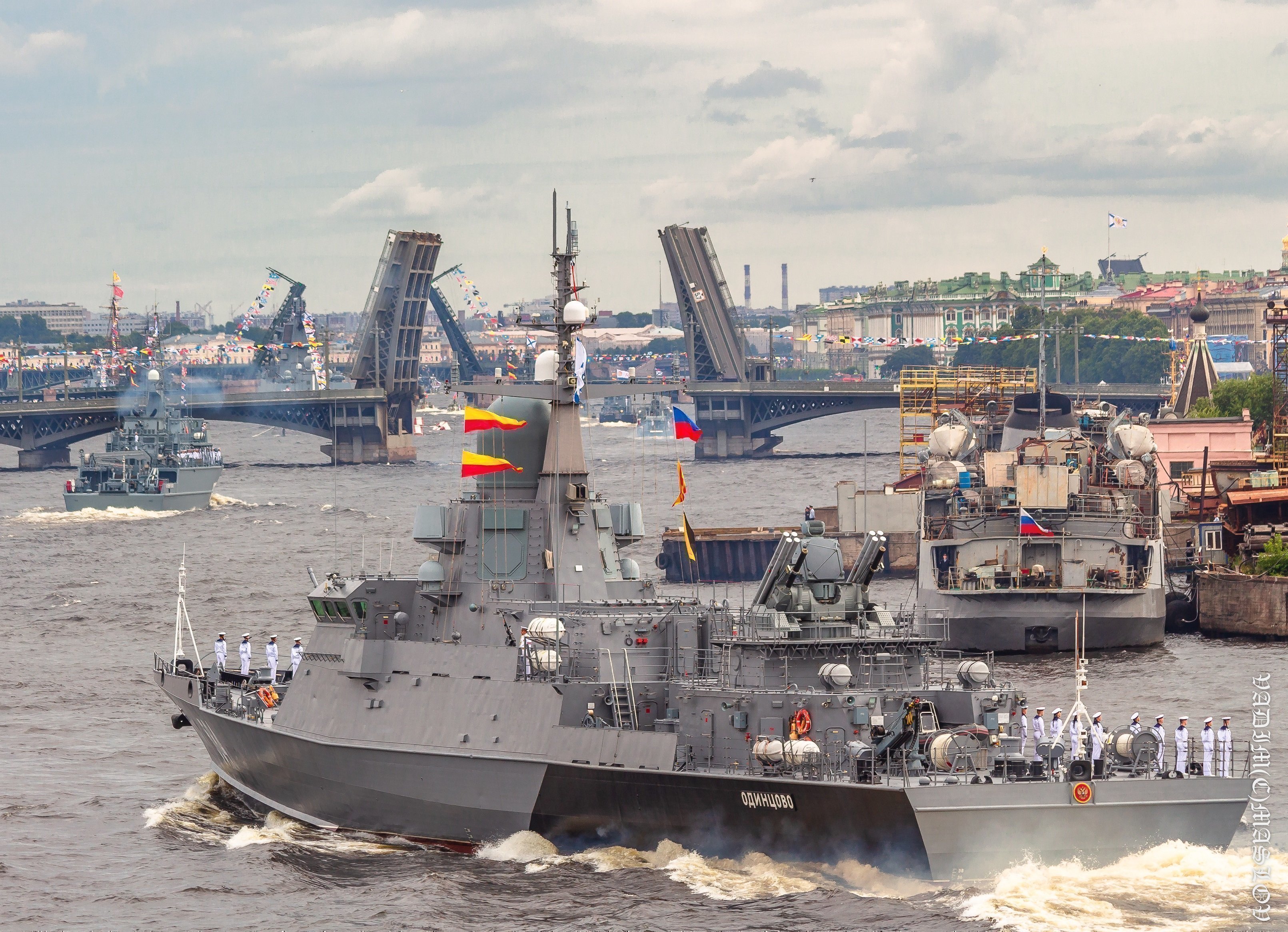 Среди участников главного военно-морского парада — ракетный крейсер «Маршал Устинов», фрегат «Адмирал Касатонов», большой противолодочный корабль «Вице-адмирал Кулаков», корветы «Гремящий» и «Стойкий», большие десантные корабли «Петр Моргунов» и «Минск», корабли противоминной обороны «Александр Обухов» и «Владимир Емельянов». Впервые в параде принял участие ракетный подводный крейсер стратегического назначения «Князь Владимир» проекта «Борей-А».