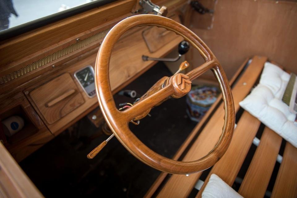 Конечно, двигатель и все механические приводы автомобиля не являются деревянными, но зато они полностью подлинные, середины 50-х годов. Автомобиль на ходу и месье Робиллард уже совершил на нем несколько поездок.